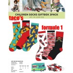 Kindersokken zonder teennaad per drie paar in een kadoverpakking met taco's of formule 1 printen gemaakt van 75% katoen, 22% polyester, 3% elasthanne